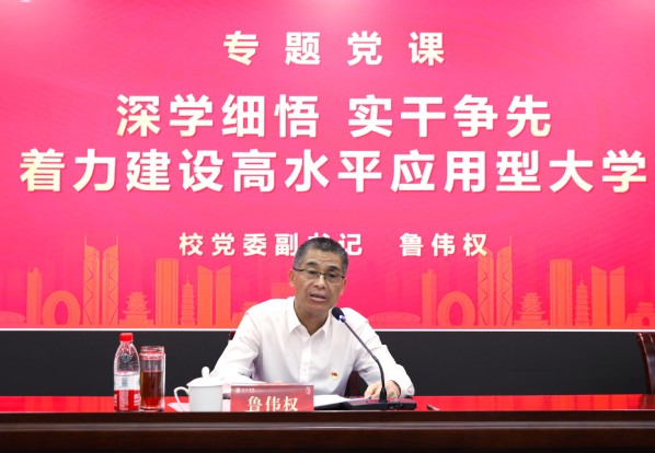 鲁伟权以“深学细悟 实干争先 着力建设高水平应用型大学”为题作专题党课,围绕“为什么学”“学什么”“怎么学以致用”等三方面内容进行了全面、深入的阐述讲解, 并对党务干部提出五点要求:一要在增强理想信念上下功夫,把理想信念时时处处体现在对党忠诚、尽职尽责、担当奉献、拼搏奋斗的实际行动上,在常学常新、常修常炼中增进理想信念;二要在强化管党意识上下功夫,重视发挥全体党员的积极性和主动性,在工作中做到充分信任党员、精心培育党员、严格要求党员、切实关心党员;三要在提升能力本领上下功夫,切实提升政治能力、学习能力、依法办事能力,在实践锻炼中练就干事、成事的本领;四要在提升落实效率上下功夫,坚持“早”字为先、“快”字当头、“效”字为要,勇于担当、主动担当,确保各项工作取得实实在在的成效;五要在增强斗争意识上下功夫,围绕中心、服务大局,敢于担当、敢于斗争,真正把斗争精神体现在方方面面,真正做助推学校高质量发展的“疾风劲草、烈火真金”。