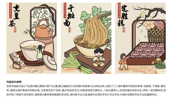 本届“金桂杯”广告创意大赛以“践行‘八八战略’,擘画美丽浙江”为主题,设公益广告、商业广告、大学生广告和“广告助农”共富行动广告四大赛道,共收到参赛作品4937件(组),四大赛道最终评选出金奖作品10件(组)、银奖作品29件(组)、铜奖作品55件(组)、优秀作品174件(组),其中大学生广告类金奖1件(组)、银奖2件(组)、铜奖7件(组)、优秀奖15件(组)。设计学院尹长根老师指导的视觉传达设计专业罗佳颖同学的《在湖州看见美丽中国—美食篇》系列作品荣获大学生广告类银奖。