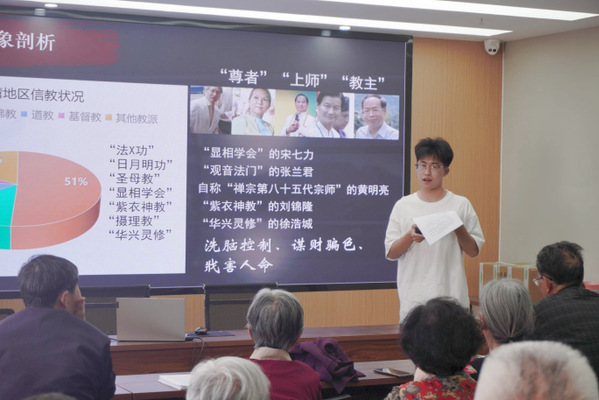 在西白鱼潭社区党员活动室,反邪教社团成员以电影《周处除三害》为切入,讲解了邪教的本质、特征、危害及防范方法,让党员们对邪教有了更直观、更深刻的认识。