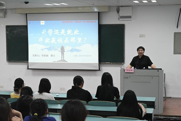 为积极引导学生规划未来,让学生近距离聆听师长宝贵经历,丰富学习体验,感悟人生道理,9月25日下午,经济管理学院举行“导师有约”第八期活动。本期活动由院党委委员、院长助理李欣桐博士为大一新生带来“升学还是就业?毕业后我该去哪里”的专题讲座。
