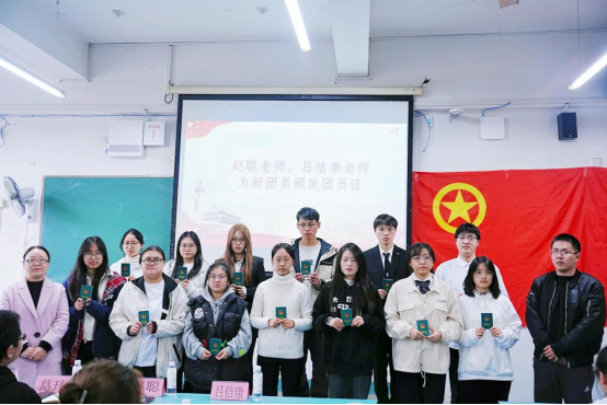 随后,学院党委副书记和团校负责老师为新团员颁发团员证,新团员在分团委组织部干事姜世芹的带领下面向团旗郑重宣誓。誓言铿锵有力,令人振奋,坚定了同学们加入共青团的决心和斗志。团校负责老师、分团委副书记和学员代表分别发言。