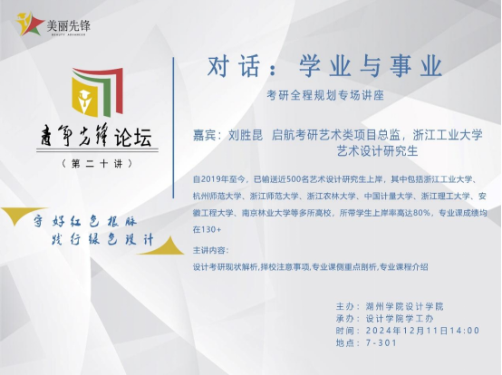 为了在学院内营造积极向上的考研氛围,帮助设计学子明确考研目标,科学规划备考路径。12月11日下午,设计学院开展了“青年先锋论坛”第二十讲暨设计类专业考研全程规划专场讲座。本次讲座邀请了启航考研艺术类项目总监刘胜昆担任主讲。